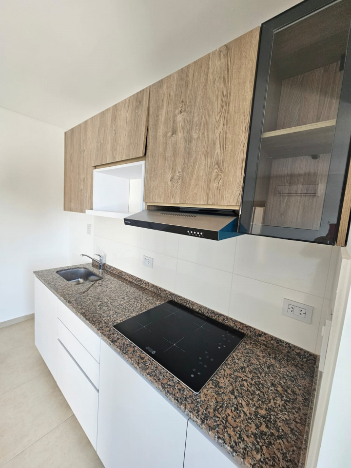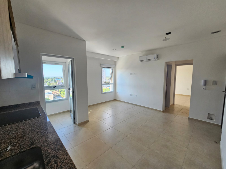 Departamento de un dormitorio con placar, cortinas black out y AA antebaño, baño, comedor -cocina con anafe y horno electrico, cortinas black out y AA, y balcón.
