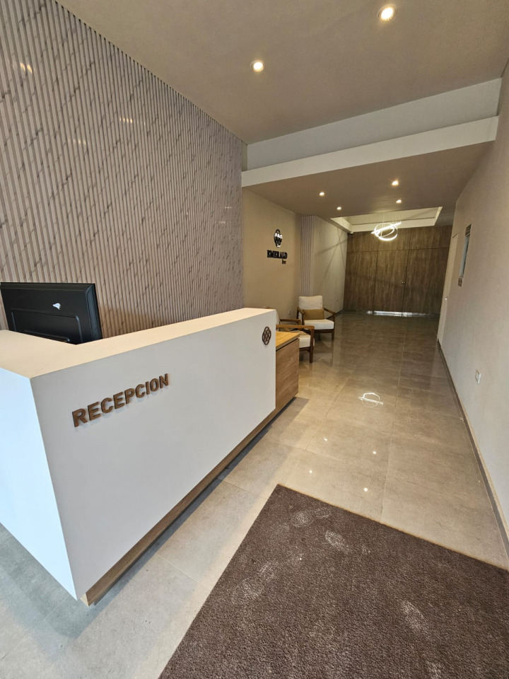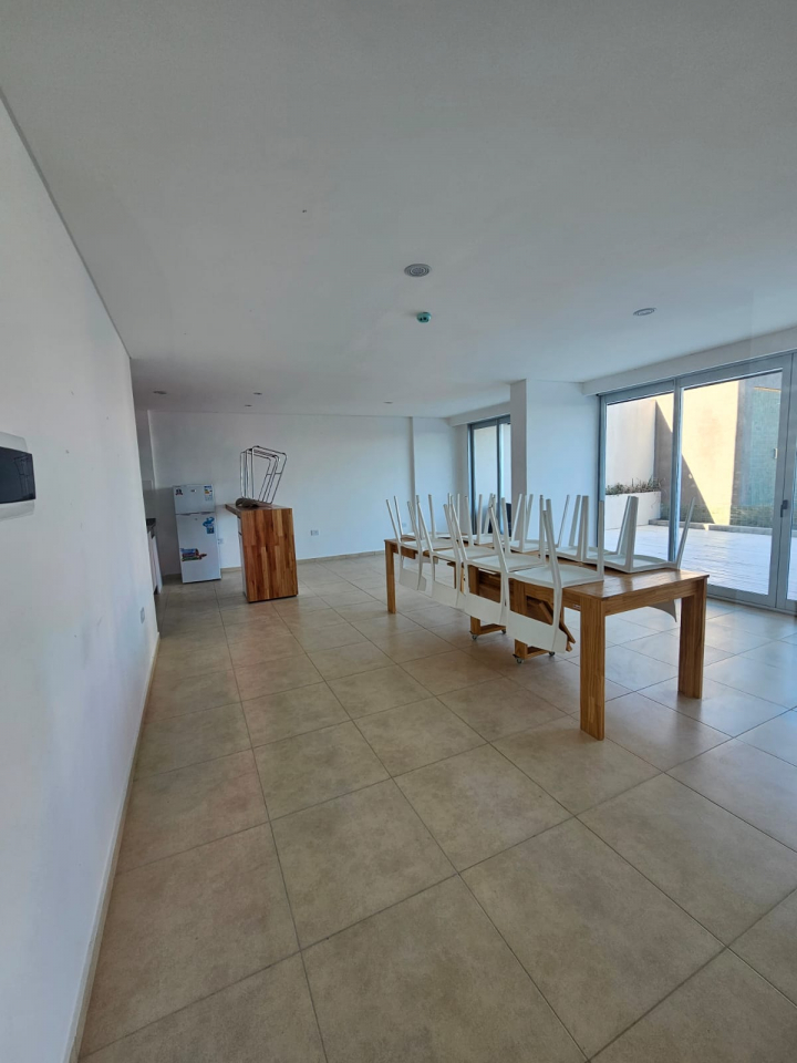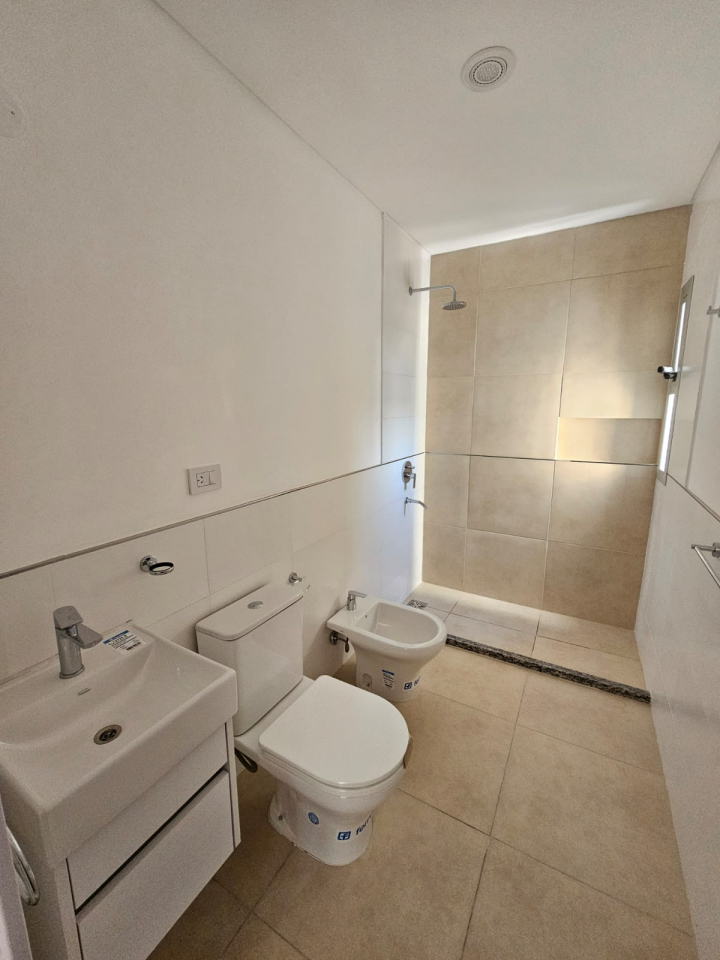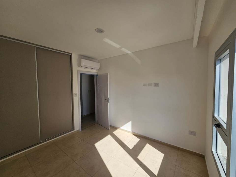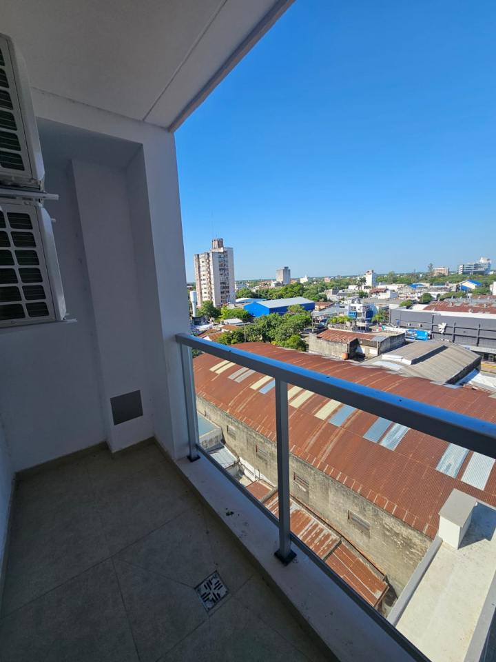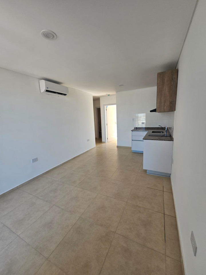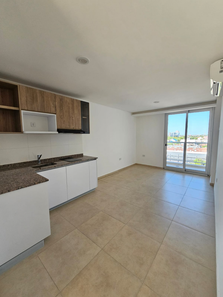 Departamento de un dormitorio con placar, y AA ante baño, baño, comedor -cocina con anafe y horno eléctrico y AA, lavadero y balcón.